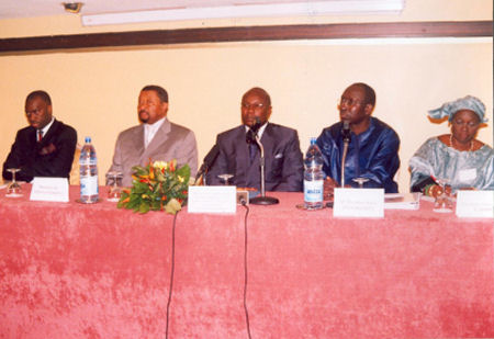 From left to right: Ambassador Nelson Cosme, CEEAC; the Minister of Foreign Affairs, Gabon; His Excellence M. Pierre Claver Mananga, Minister of Human Rights, Gabon; Ibrahima Kane, Senior Lawyer, INTERIGHTS; and Mme. Reine Alapini-Gansou, Commissioner with the African Commission |